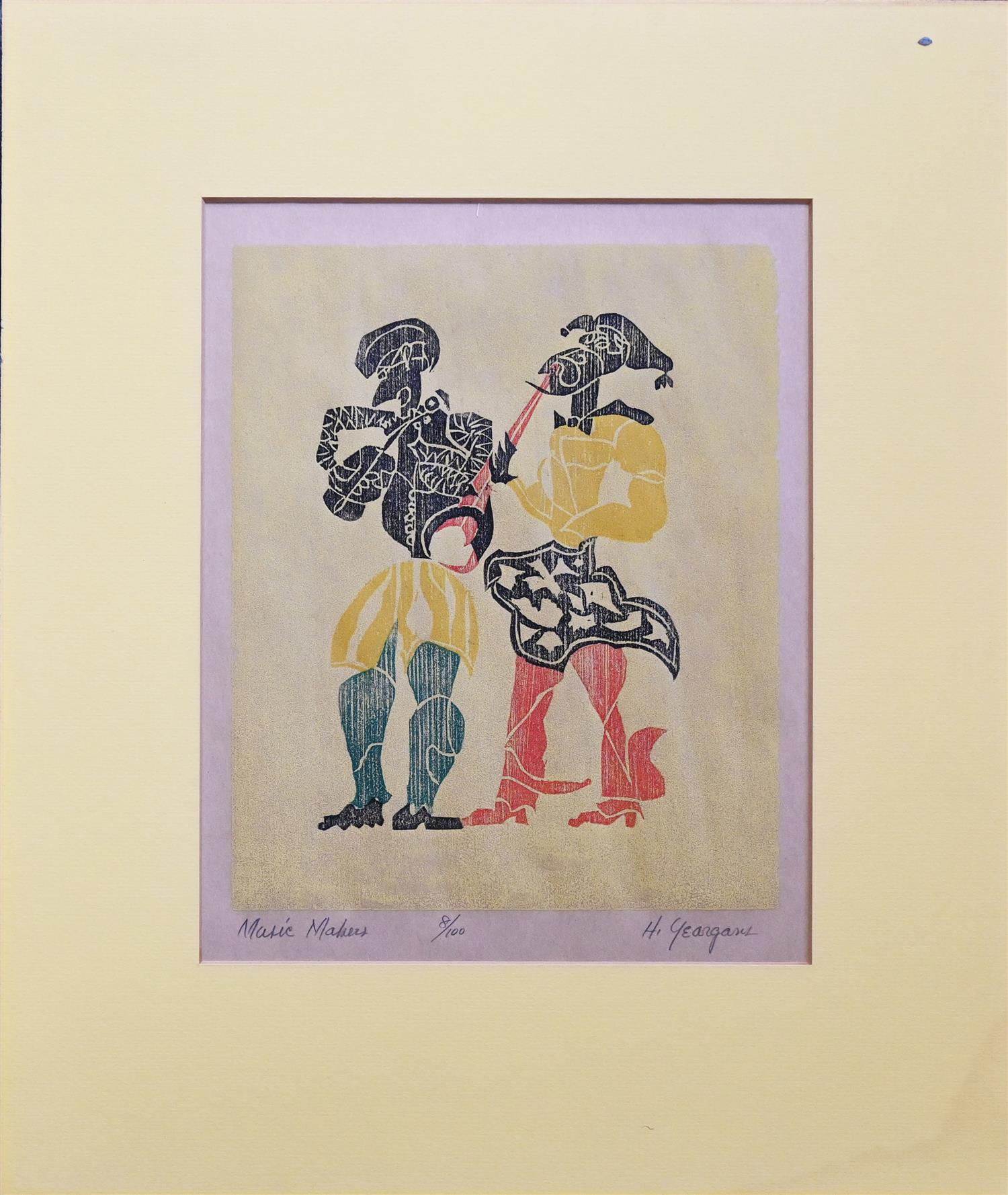 HARWELL YEARGARRS, MUSIC MAKERS, WOODBLOCK 8/100, 24.5 X 20CM, TITLED, NUMBERED AND SIGNED BELOW IMAGE