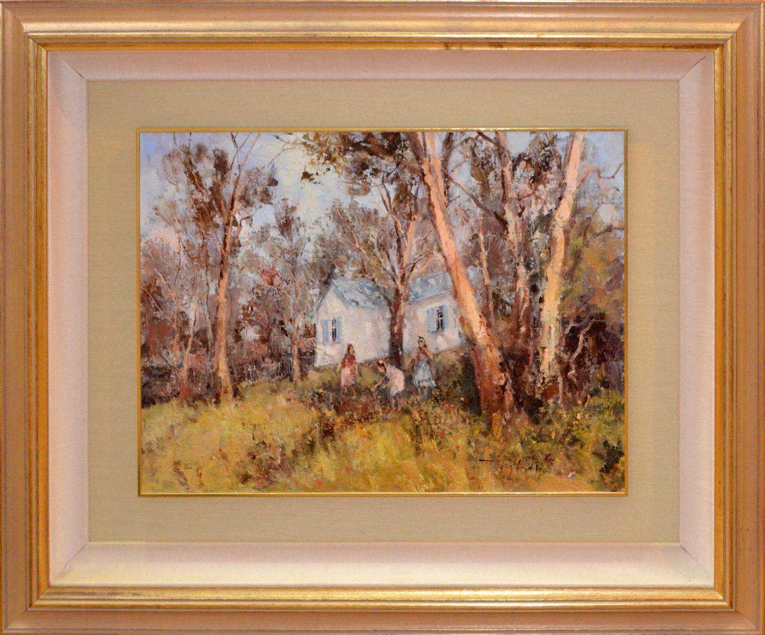 JOHN TIPLADY, GIRLS AT BLUE COTTAGE, OIL ON BOARD, 38 X 50CM, FRAME: 67 X 80CM, LEONARD JOEL DELIVERY SIZE: MEDIUM