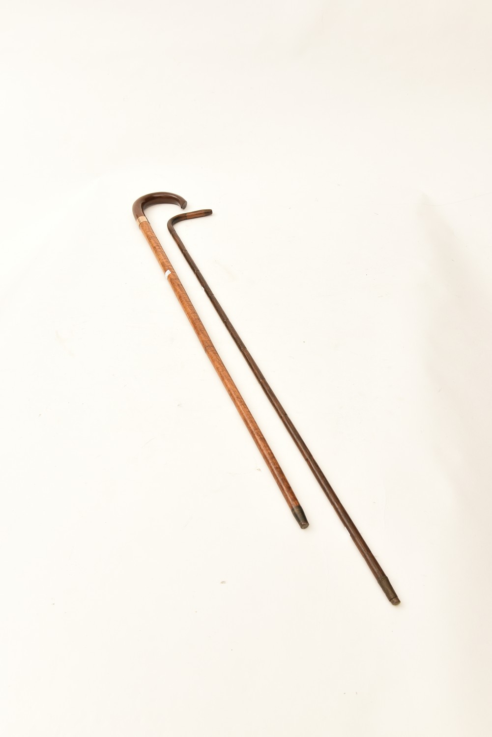 A FIDDLE BACK BLACKWOOD WALKING STICK (A/F) WITH MONOGRAMMED 9CT GOLD COLLAR TOGETHER WITH WALKING CANE, LEONARD JOEL LOCAL DELIVERY SIZE: SMALL (90 CM H)
