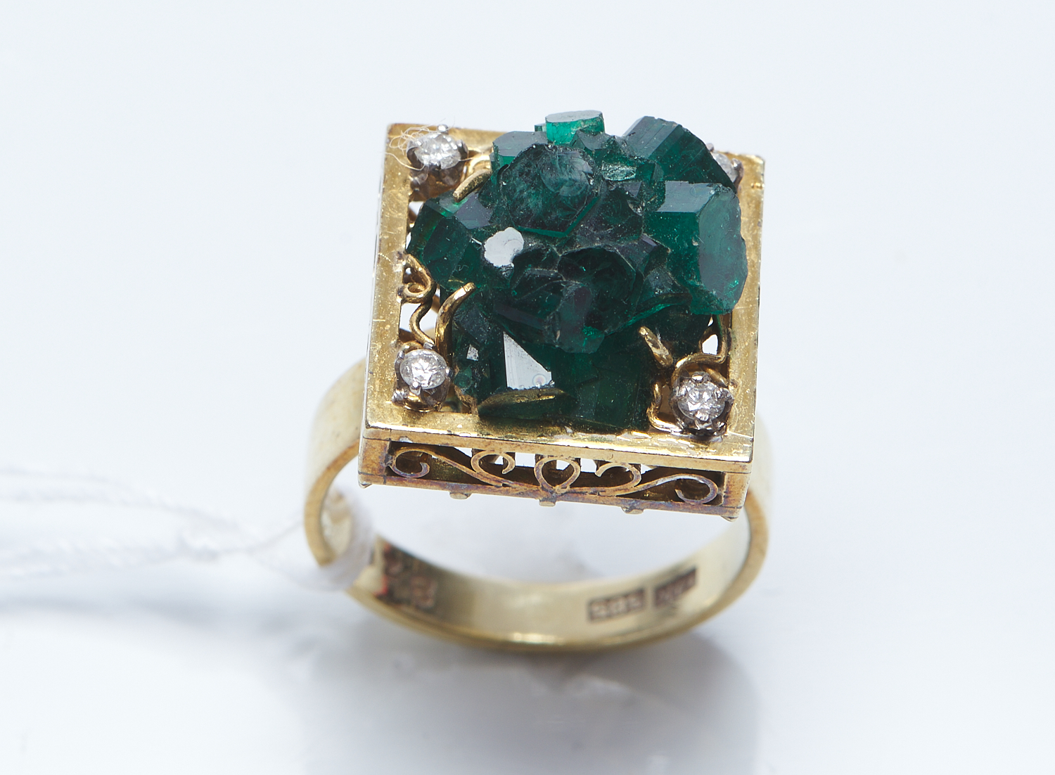 A VINTAGE SYNTHETIC EMERALD AND DIAMOND RING IN 14CT GOLD, SIZE M-N, 8.1GMS