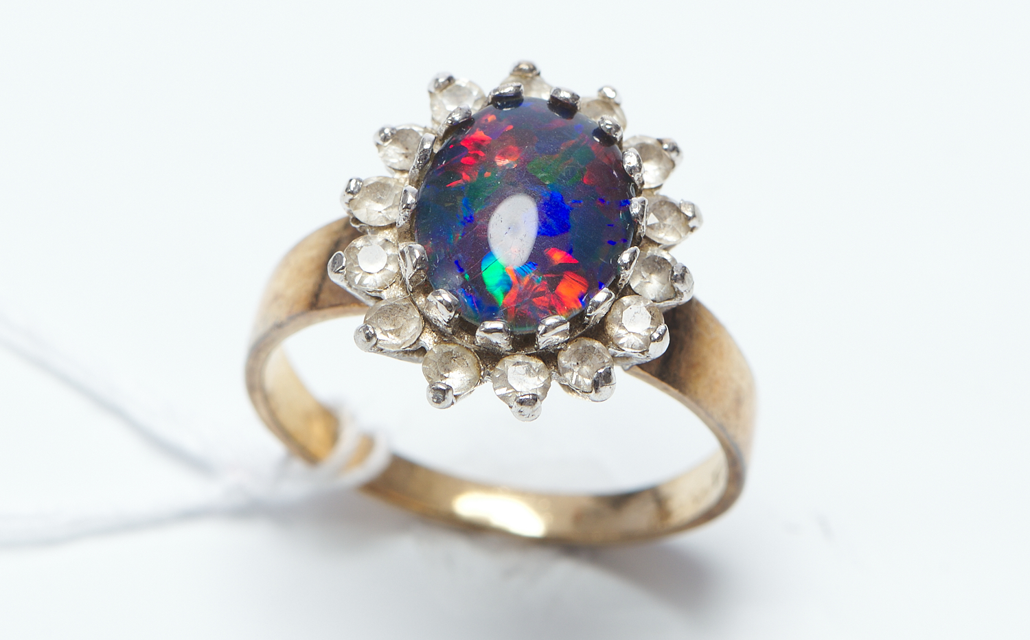 AN OPAL DOUBLET AND WHITE STONE RING IN 9CT GOLD, SIZE O, 3.7 GMS
