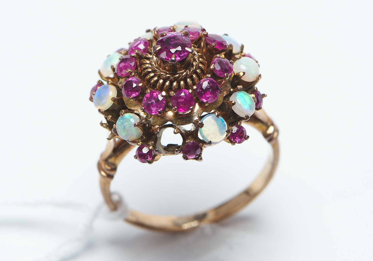 A CRYSTAL OPAL AND RUBY PRINCESS RING IN 14CT GOLD, SIZE N, 5.6GMS A/F (SOME STONES DEFICIENT)