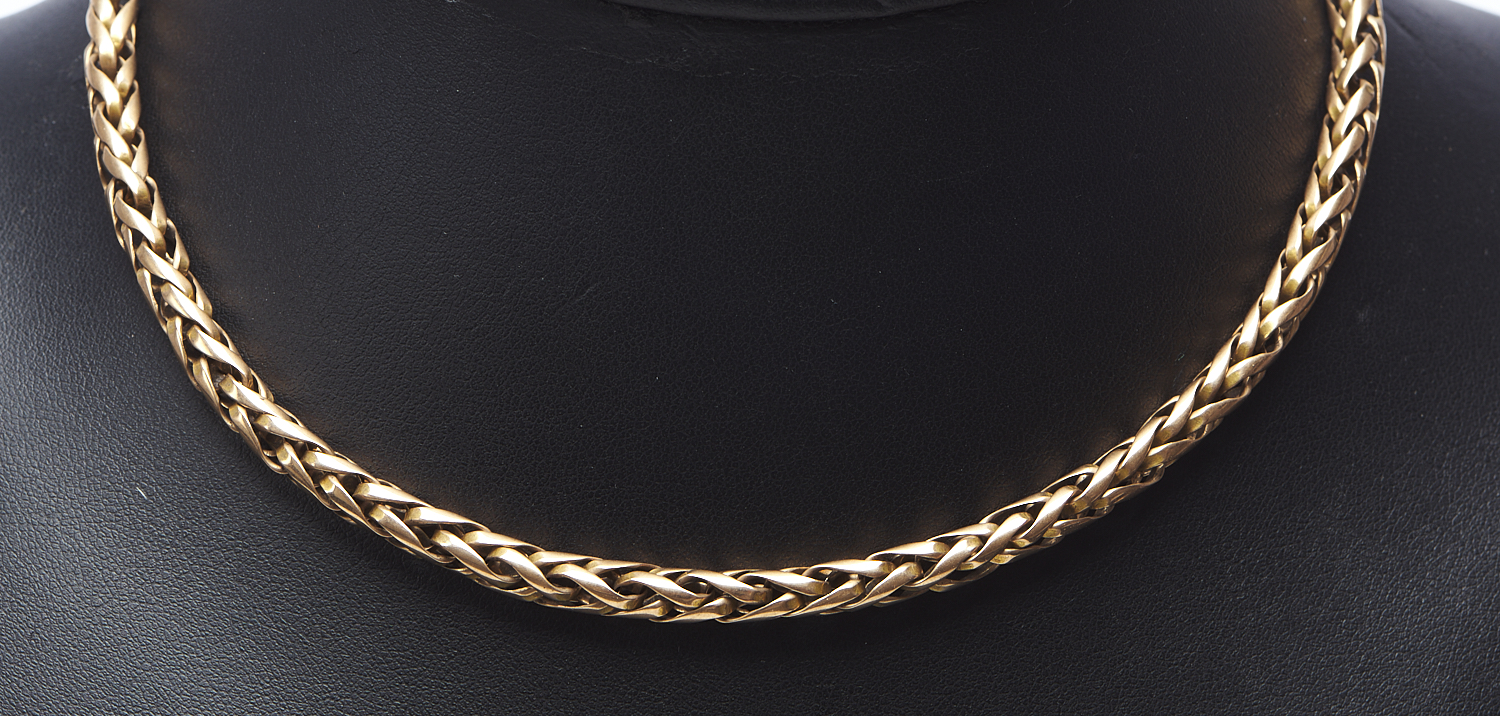 A FANCY LINK CHAIN IN 9CT GOLD PLATE, LENGTH INCLUDING CLASP 39.5CM