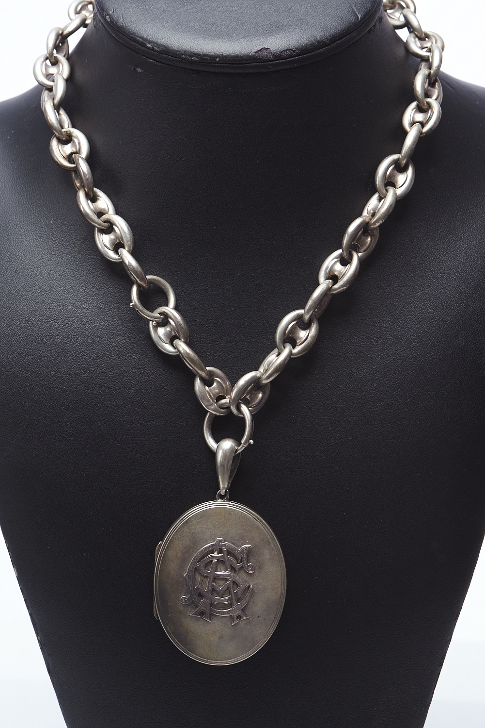 AN ANTIQUE LOCKET IN SILVER AND CHAIN IN SILVER PLATE, LENGTH OF LOCKET 7CMS, LENGTH OF CHAIN 48.5CMS