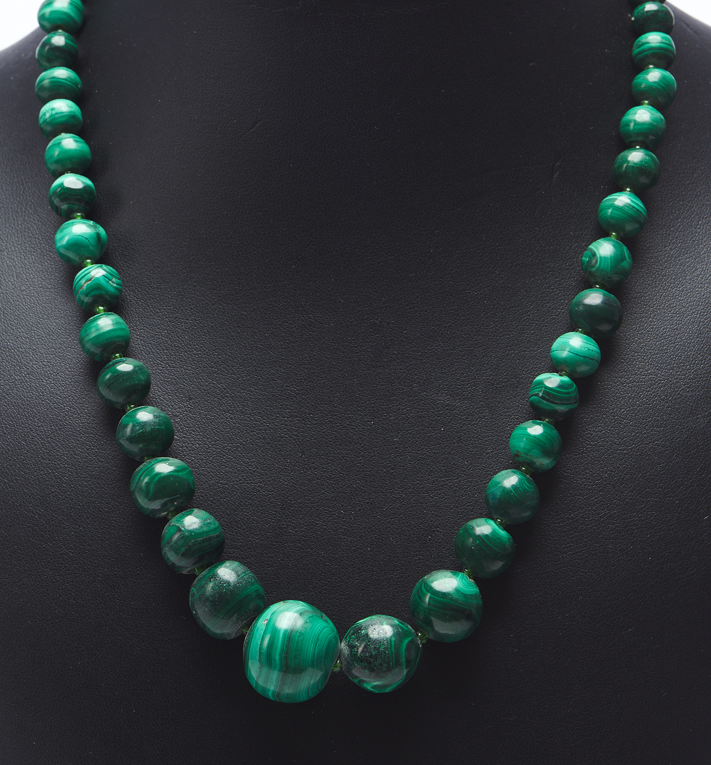 AN ANTIQUE GRADUATED MALACHITE BEAD NECKLACE, TO A SCREW CLASP, THE BEADS MEASURING FROM 7.0MM TO 19.0MM, LENGTH 50CMS