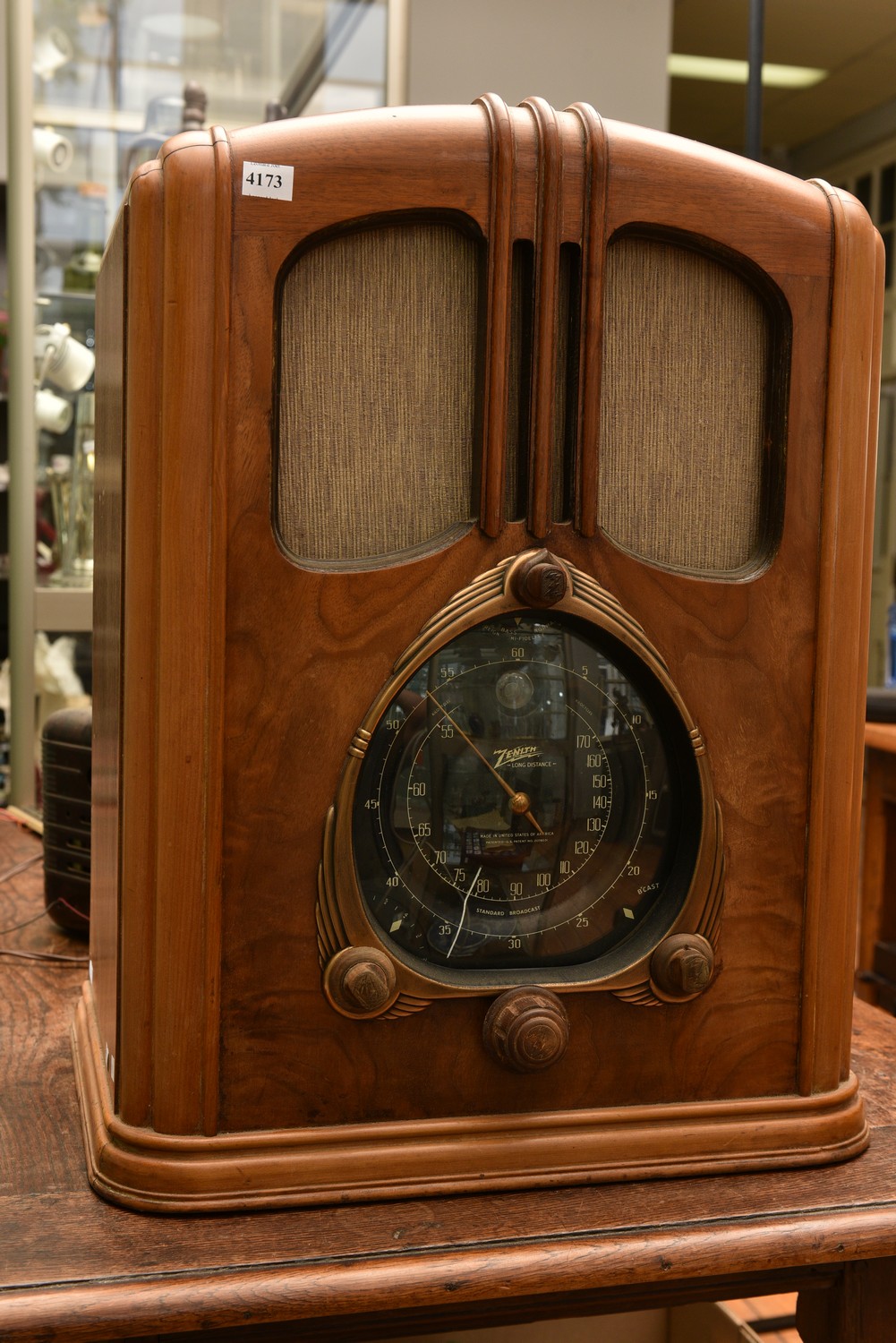 A TIMBER CASED ART DECO ZENITH RADIO (59 CM), LEONARD JOEL LOCAL DELIVERY SIZE: MEDIUM