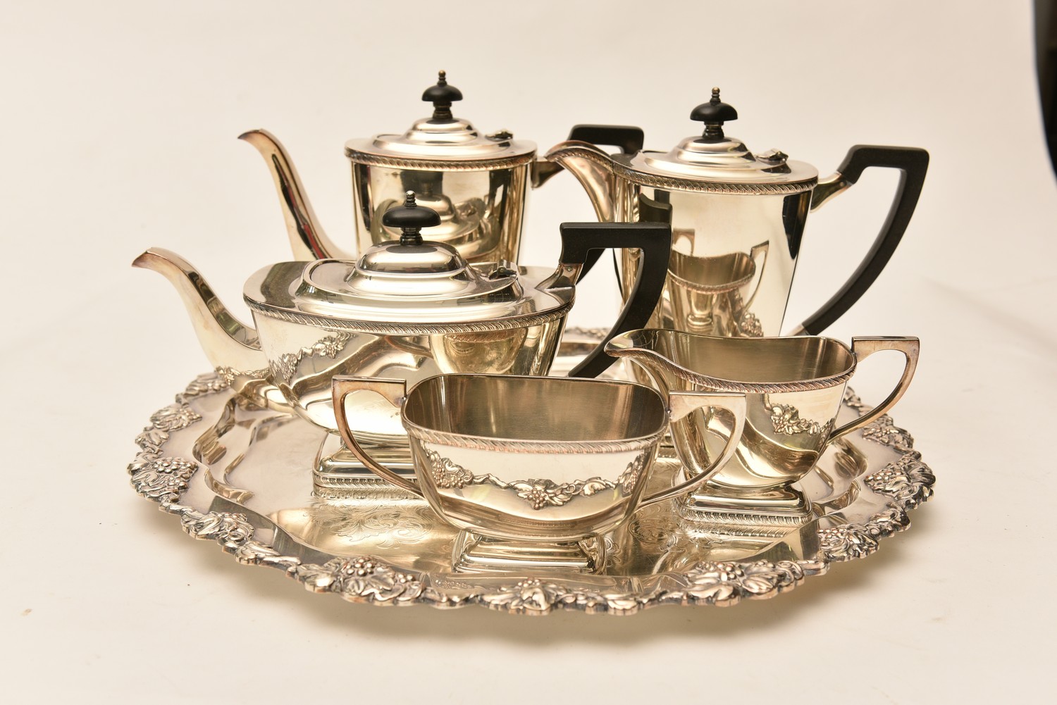 A FIVE PIECE SHEFFIELD REPRODUCTION SILVERPLATE TEA AND COFFEE SERVICE TOGETHER WITH A SILVERPLATED CIRCULAR TRAY (41.5 CM W), LEONARD JOEL LOCAL DELIVERY SIZE: SMALL