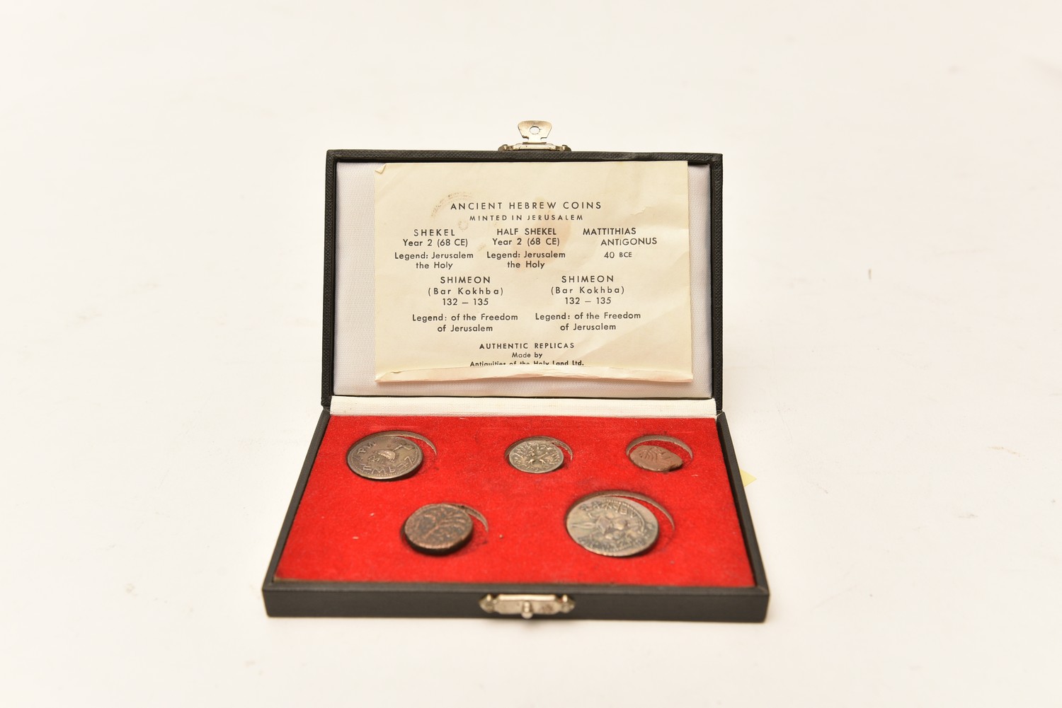 A BOXED GROUP OF FIVE REPLICA ANCIENT HEBREW COINS (14 CM W), LEONARD JOEL LOCAL DELIVERY SIZE: SMALL