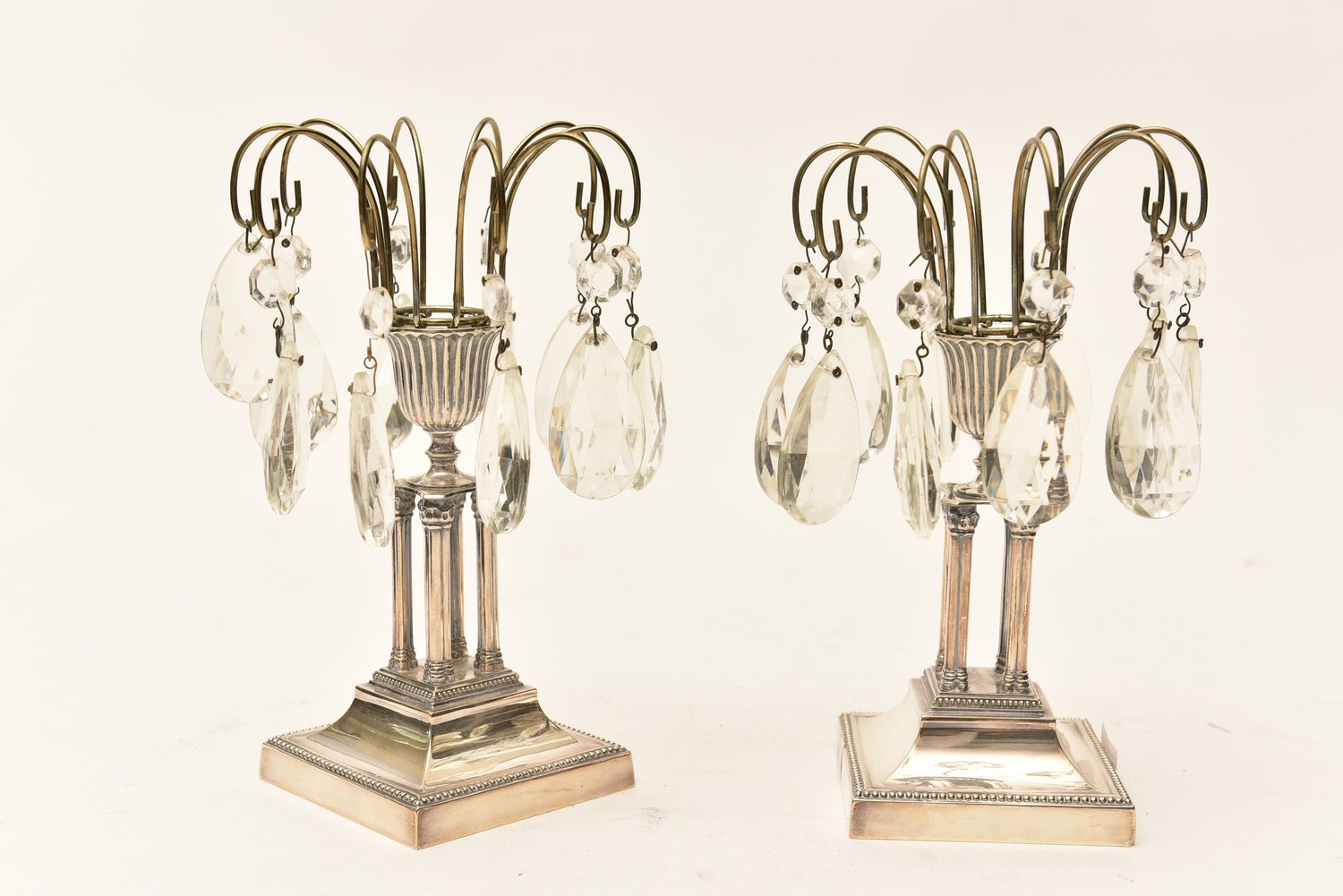 A PAIR OF CLASSICAL SILVER PLATE CANDLE STICKS WITH LUSTRES (20 CM H), LEONARD JOEL LOCAL DELIVERY SIZE: SMALL