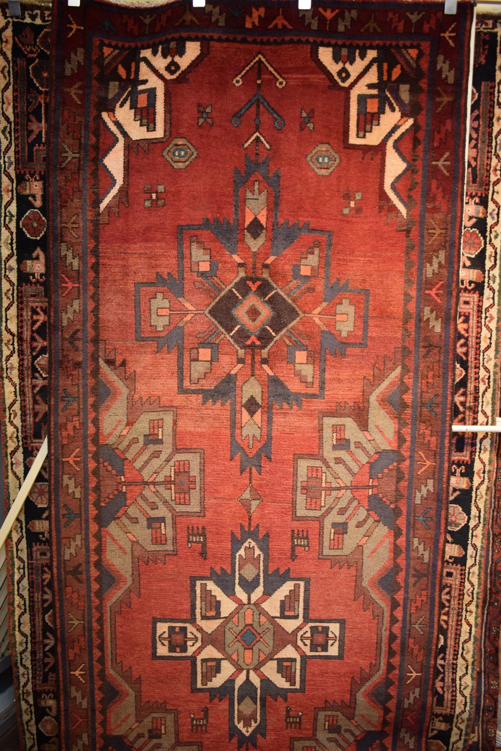 A MAGNIFICENT TRIBAL BAKHTIARI HALL RUNNER. 100% WOOL. SOLID & HARD-WEARING. HAND-KNOTTED TRIBAL WEAVE WITH RARE DESIGN OF BOLD STYLIZED MEDALLIONS AND SEMI-MEDALLIONS IN A BEAUTIFUL DEEP CRIMSON FIELD. GALLERY INVENTORY. IN EXCELLENT CONDITION. CERTIFICATE OF AUTHENTICITY INCLUDED. SIZE: 380X123CM ORIGIN: PERSIA - RRP: $2,600