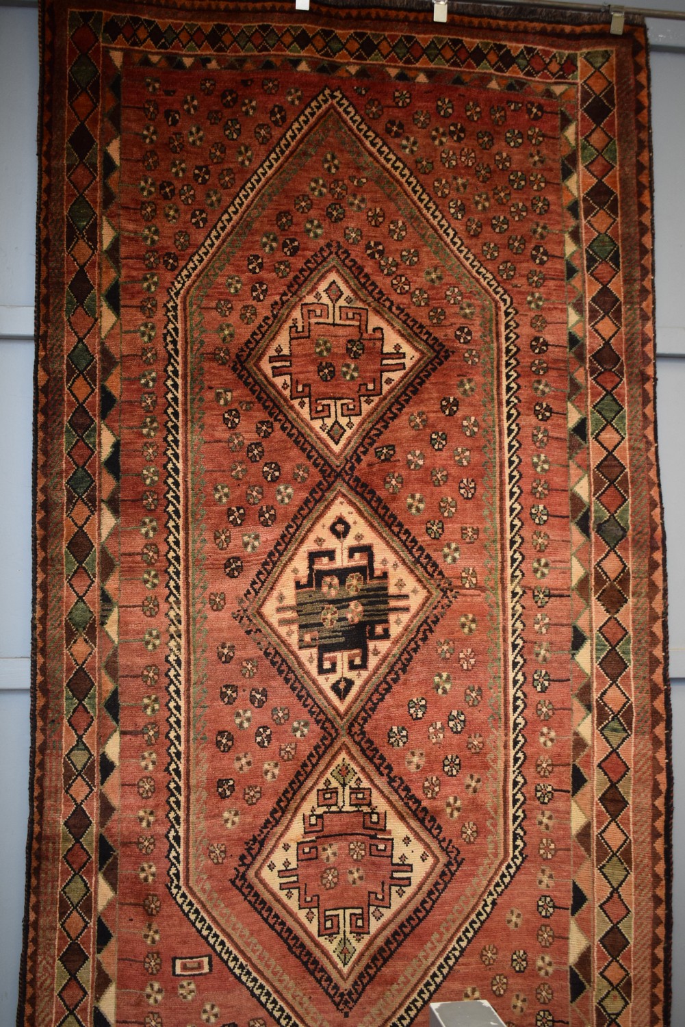 A TRIBAL PERSIAN LURI RUG. 100% WOOL. NATURAL DYES WITH ABRASH DISCOLORATION. DENSE WOOL FOUNDATION. HAND-KNOTTED TRIBAL WEAVE WITH DESIGN OF ANCHORED MEDALLIONS AND FLORAL PATTERNS SET IN A MADDER CARMINE COLOUR WITH GEOMETRIC MINOR BORDER. EXCELLENT CONDITION. GALLERY INVENTORY. CERTIFICATE OF AUTHENTICITY INCLUDED. SIZE: 285X155CM ORIGIN: PERSIA - RRP: $2,900