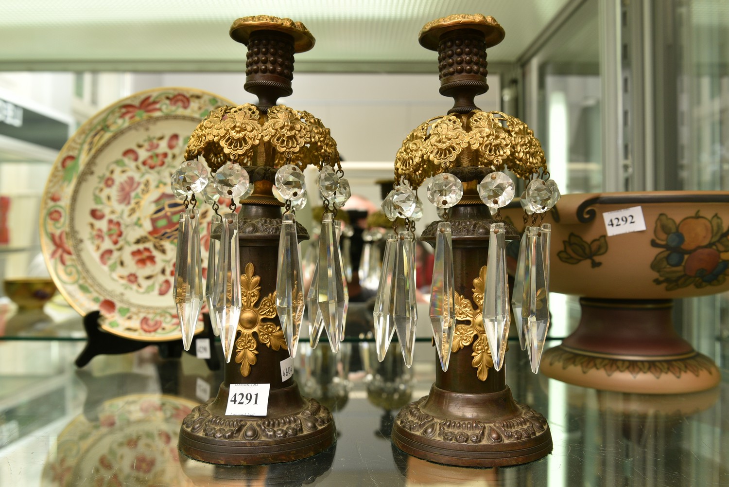 A PAIR OF REGENCY STYLE CANDLE HOLDERS WITH BRASS MOUNTS AND CRYSTAL LUSTRES, LEONARD JOEL LOCAL DELIVERY SIZE: SMALL (24 CM H)