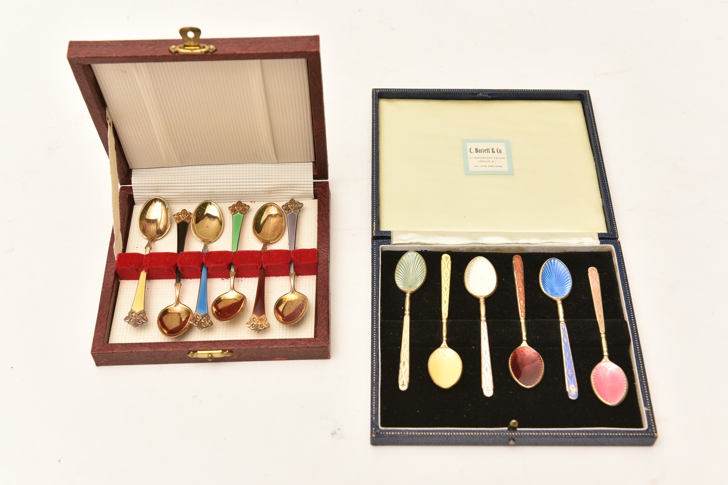 TWO CASED SETS OF SILVER AND ENAMEL COFFEE SPOONS INCLUDING BIRMINGHAM STERLING SILVER AND NORWEGIAN STERLING (BOX 15 CM W), LEONARD JOEL LOCAL DELIVERY SIZE: SMALL