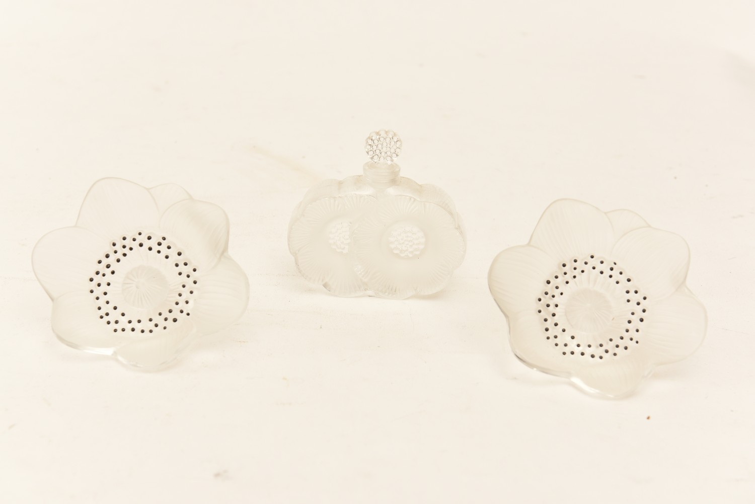 A LALIQUE POPPY PERFUME BOTTLE TOGETHER WITH TWO LALIQUE ANEMONES (10 CM W), LEONARD JOEL LOCAL DELIVERY SIZE: SMALL
