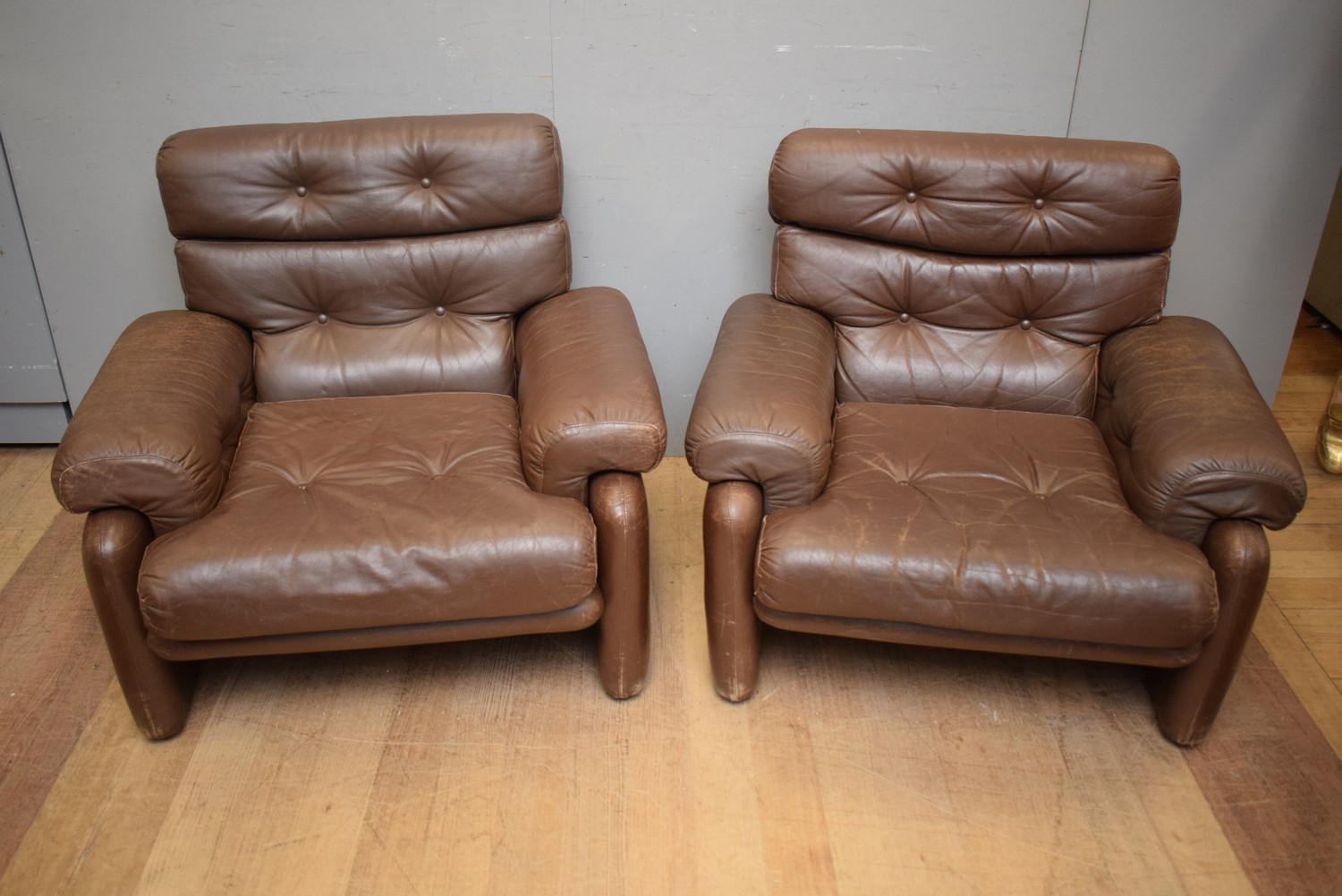 A PAIR OF CHOCOLATE LEATHER B&B ITALIA STYLE ARMCHAIRS (A/F) (88H x 100W x 95D CM) (LEONARD JOEL DELIVERY SIZE: LARGE)