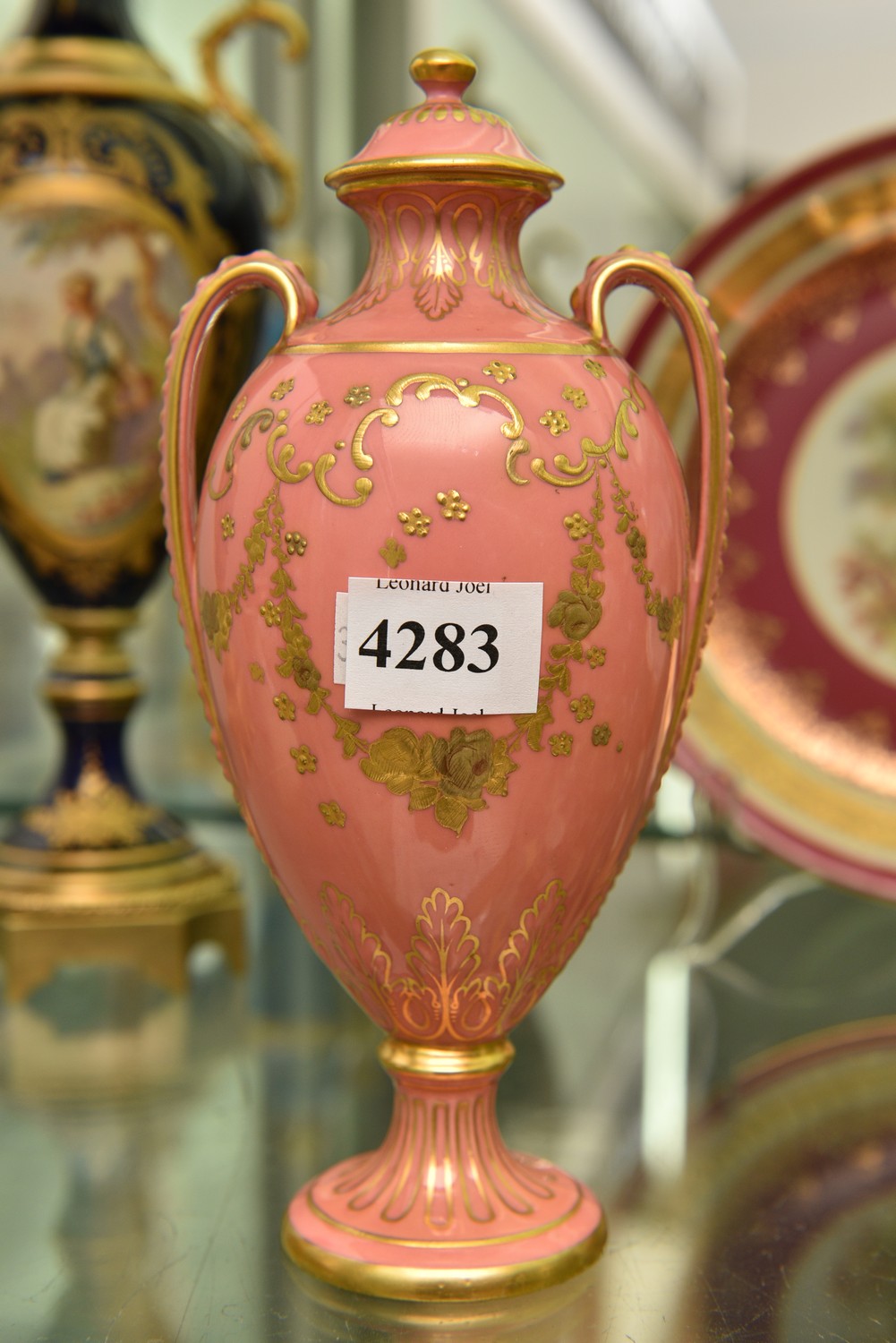 A ROYAL CROWN DERBY VASE AND COVER, PUCE GROUND, LEONARD JOEL LOCAL DELIVERY SIZE: SMALL (17 CM H)