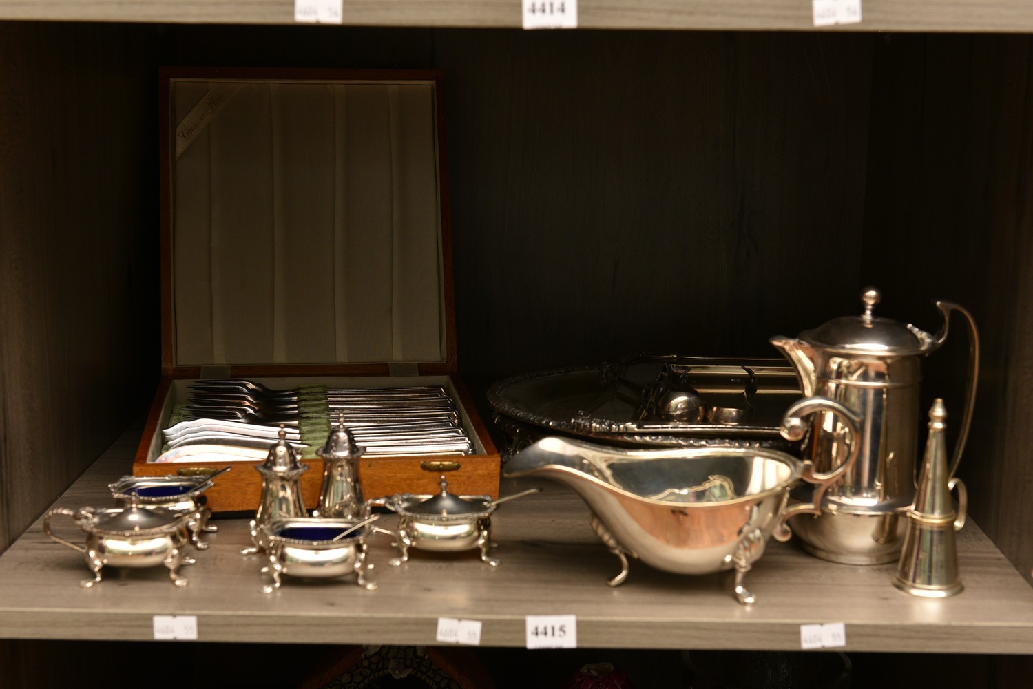A SHELF OF SILVERPLATE INCLUDING TRAYS, CASED FISH SERVICE, CRUETS ETC, LEONARD JOEL LOCAL DELIVERY SIZE: SMALL (31 CM W)