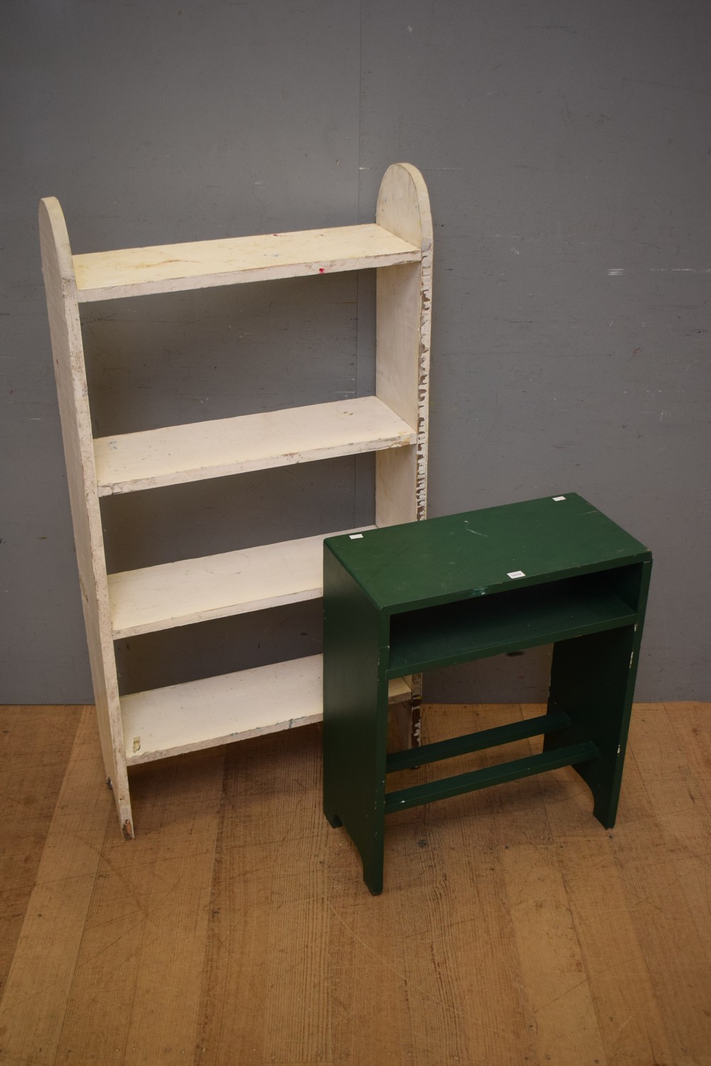 A FOUR TIER WHITE PAINTED WOODEN 1950S BOOKSHELF AND A PAINTED GREEN TWO TIER TABLE (LARGEST 119H x 62W x 19D CM) (LEONARD JOEL DELIVERY SIZE: MEDIUM)