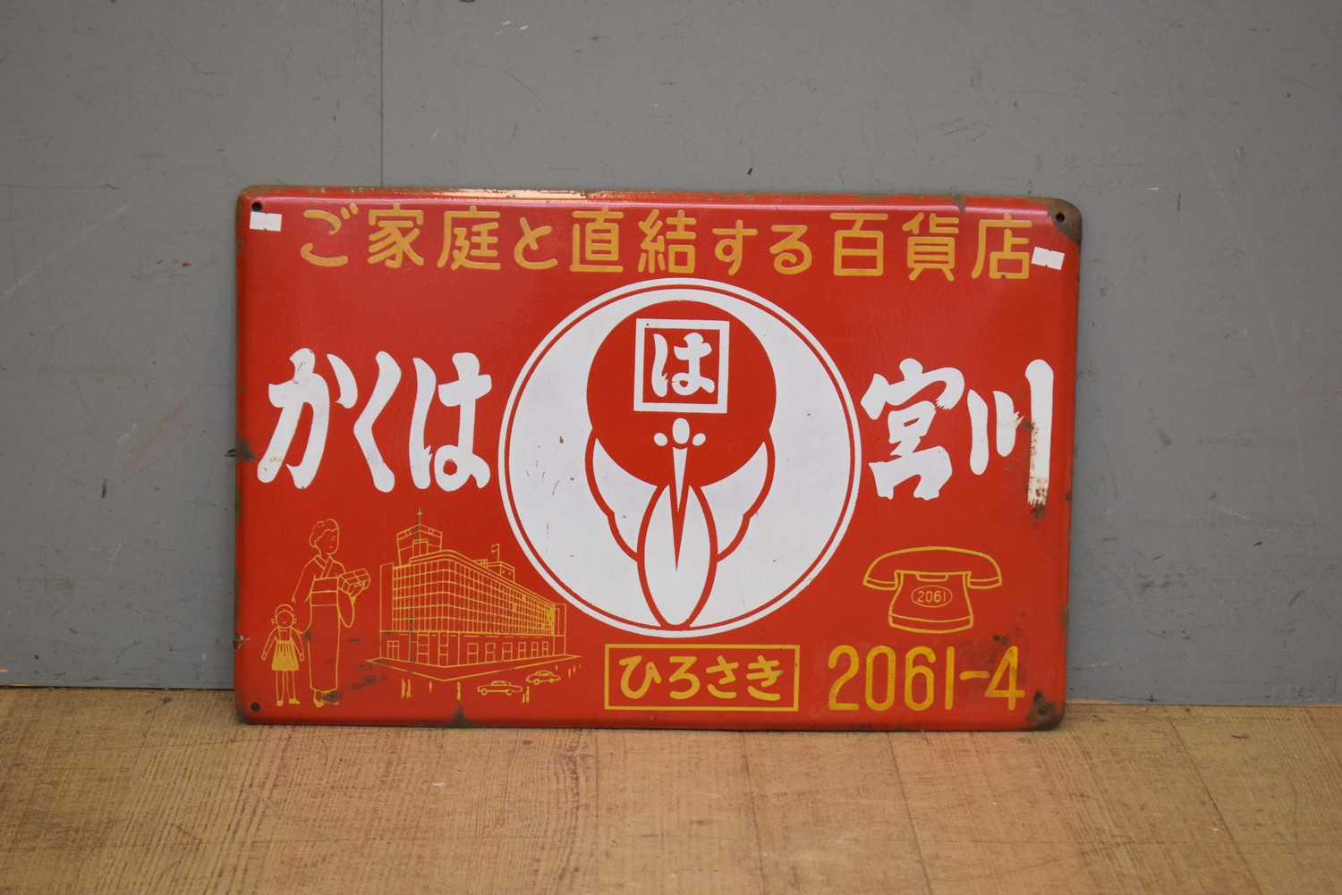 A RED WHITE AND YELLOW PICTORIAL JAPANESE ENAMEL ADVERTISING SIGN (41H x 60W CM) (LEONARD JOEL DELIVERY SIZE: MEDIUM)