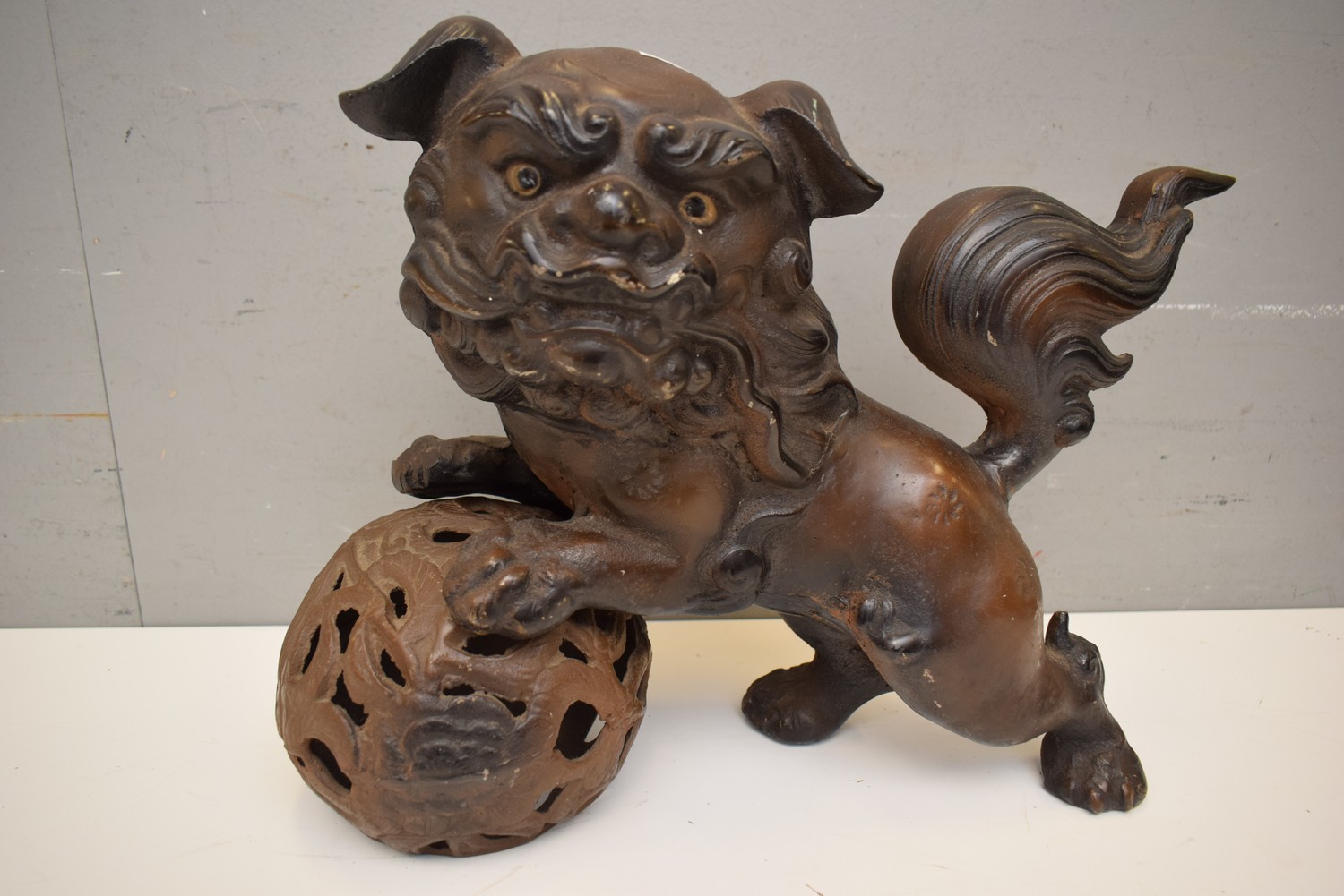 AN ORIENTAL BRONZED METAL SHISHI LION FIGURE ON BALL (LEONARD JOEL DELIVERY SIZE: SMALL)