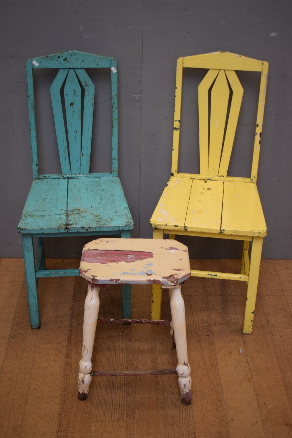 PAIR OF 1940S PAINTED HEAVY WOODEN CHAIRS AND A PAINTED 1900S WOODEN MILKING STOOL (CHAIR 94H x 40W x 41D CM) (LEONARD JOEL DELIVERY SIZE: MEDIUM)