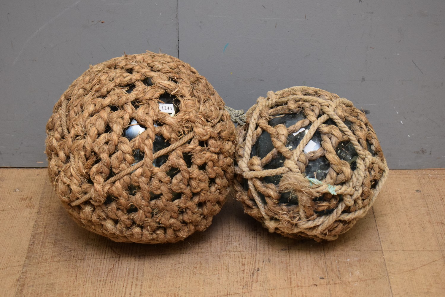 2 X 1900S GREEN GLASS NATURAL FIBRE COVERED SHIPS FLOATS / FISHING BUOYS (34D CM) (LEONARD JOEL DELIVERY SIZE: SMALL)