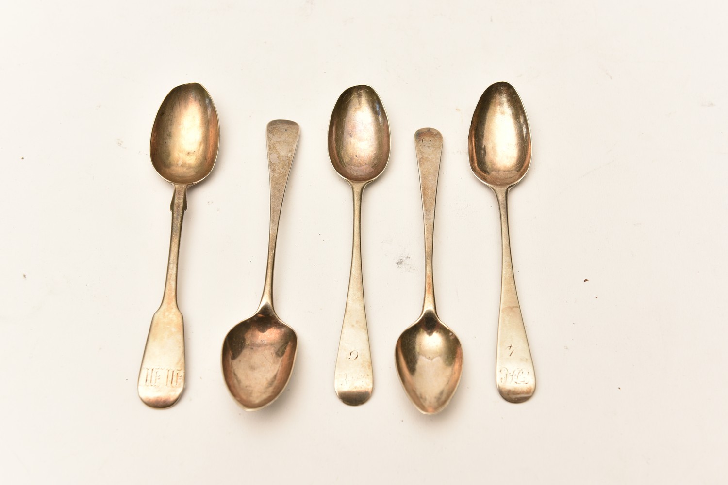 FIVE STERLING SILVER TEASPOONS, VARIOUS MAKERS, DATES AND PATTERNS (14 CM W), LEONARD JOEL LOCAL DELIVERY SIZE: SMALL
