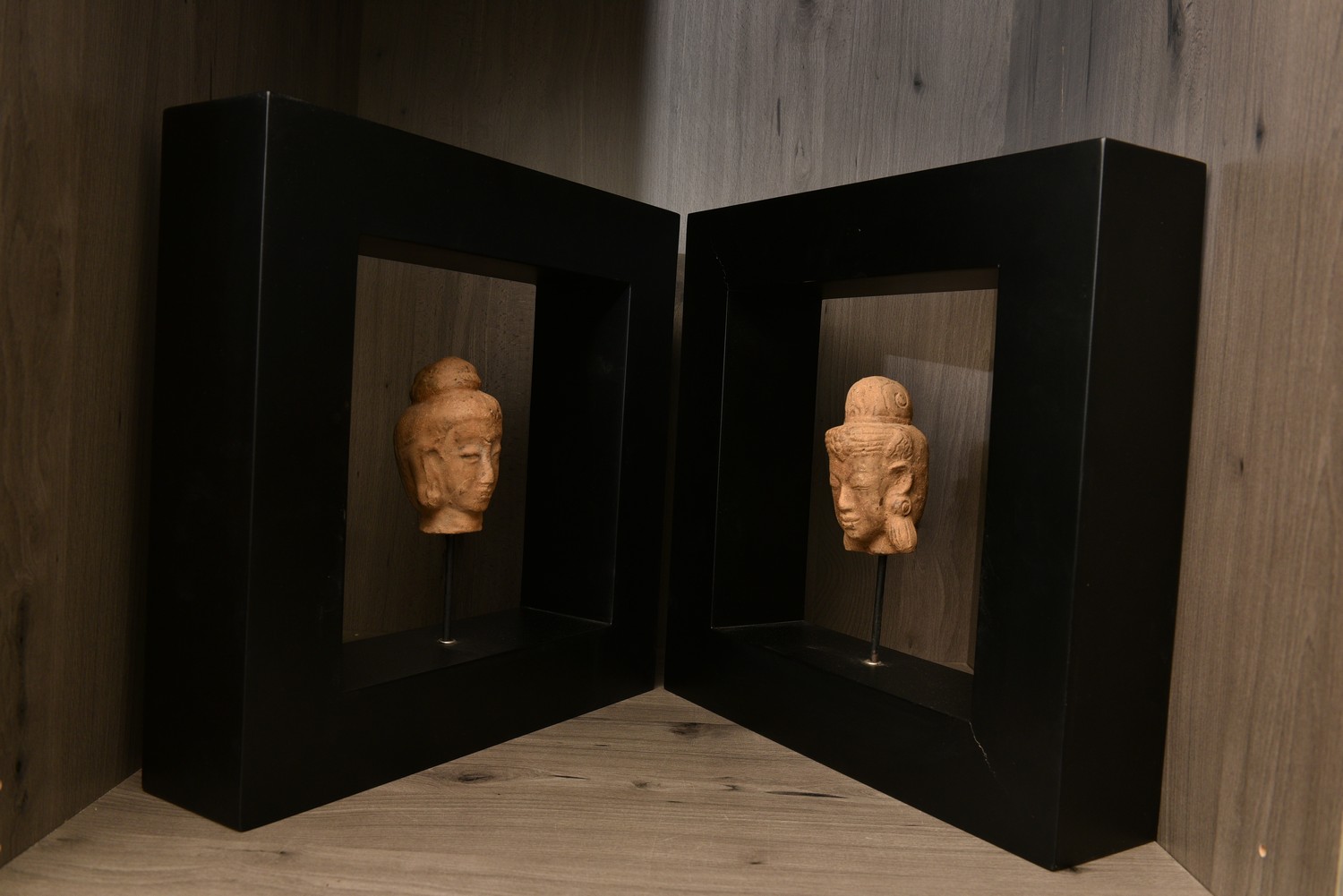 TWO STONE HEADS IN BLACK BOXES, LEONARD JOEL LOCAL DELIVERY SIZE: SMALL (37 CM H)