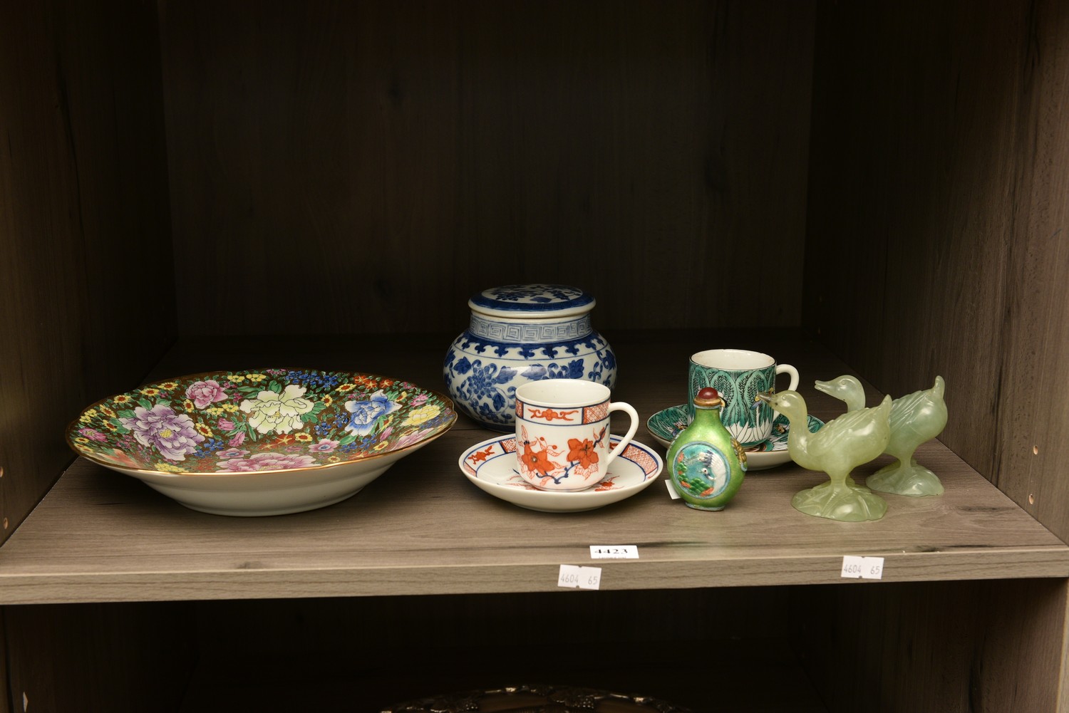 A SHELF OF ASIAN ITEMS INCLUDING ENAMEL SNUFF BOTTLE, PORCELAIN AND TWO HARDSTONE CARVED DUCK FIGURINES, LEONARD JOEL LOCAL DELIVERY SIZE: SMALL (23 CM D)