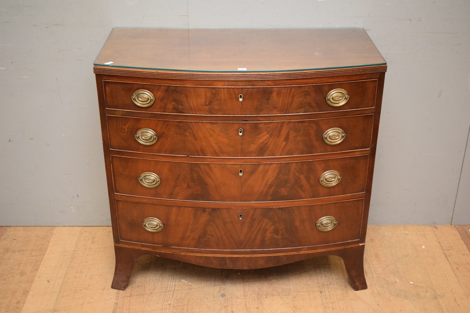 AN EARLY VICTORIAN MAHOGANY BOW FRONTED CHEST OF DRAWERS (A/F) (88H x 92W x 47D CM) (LEONARD JOEL DELIVERY SIZE: LARGE)