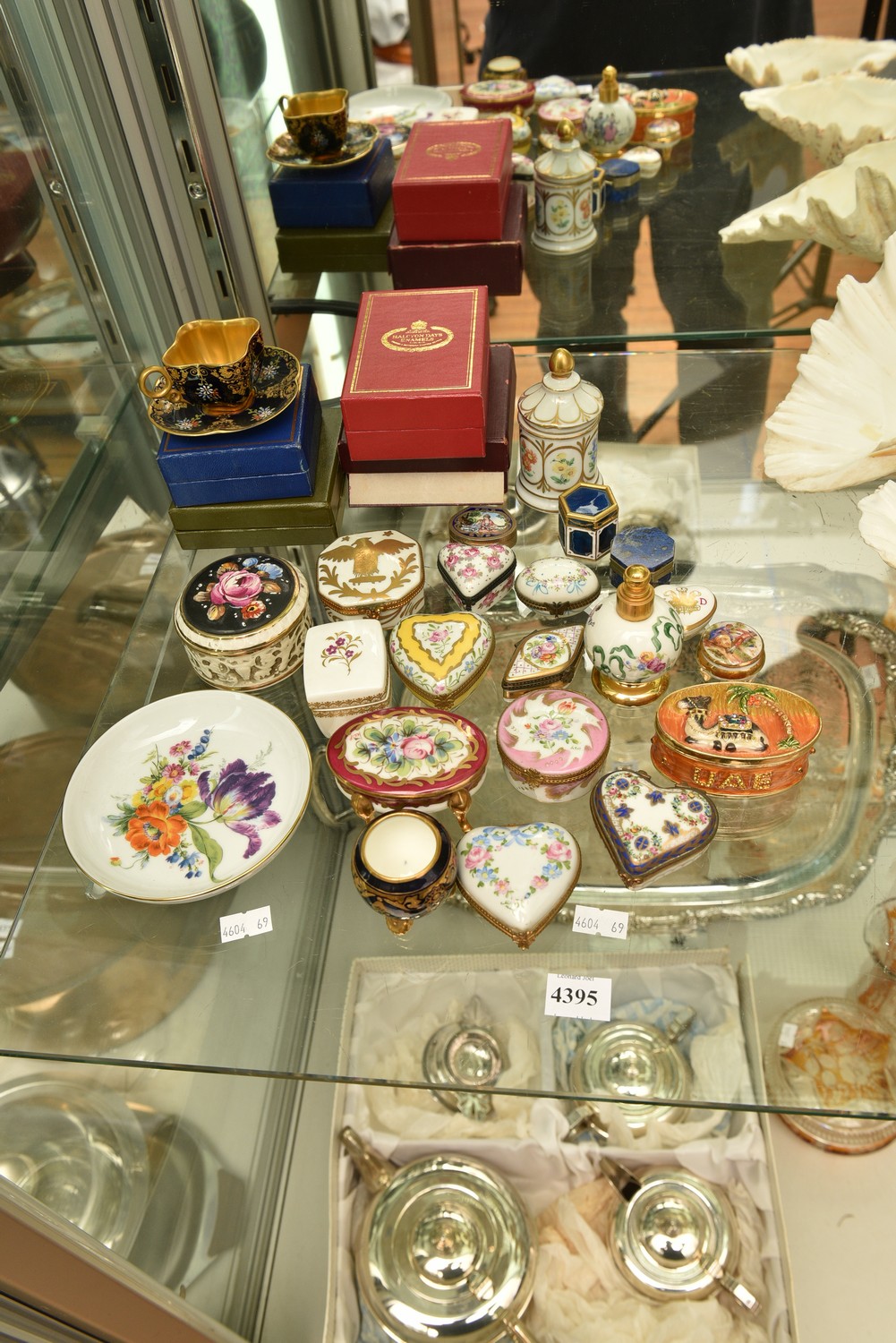 A LARGE COLLECTION OF TRINKET BOXES, DISHES AND DEMI TASSE CUP AND SAUCER INCLUDING LIMOGES, LEONARD JOEL LOCAL DELIVERY SIZE: SMALL (11 CM D)