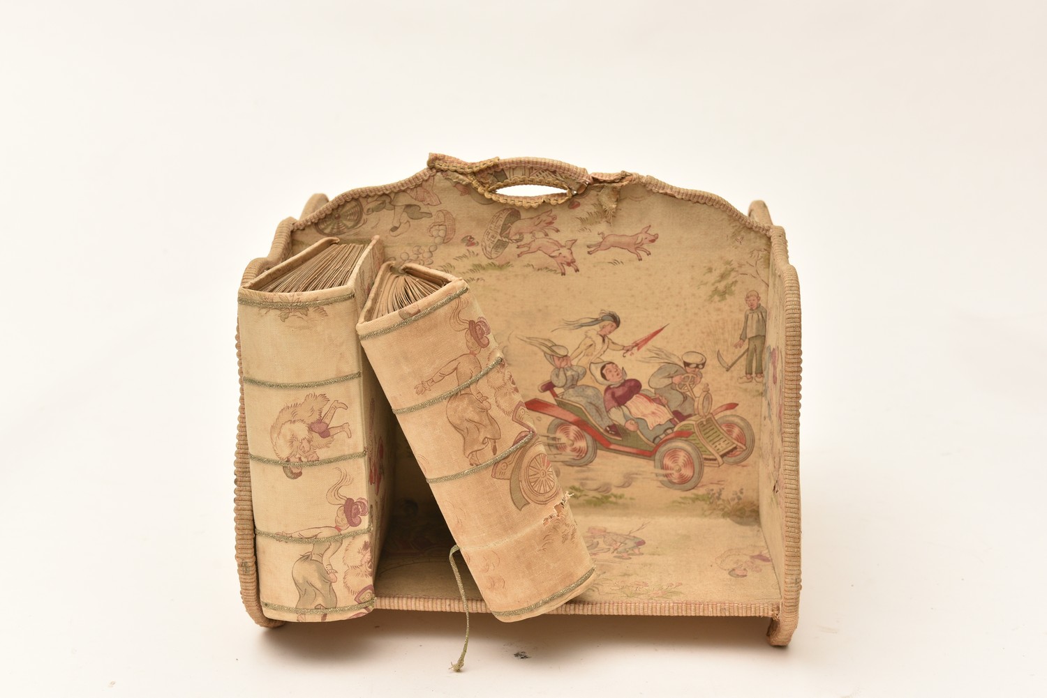 A VINTAGE FRENCH FABRIC COVERED SMALL SHELF WITH TWO ALBUMS (A/F) 28 cms W