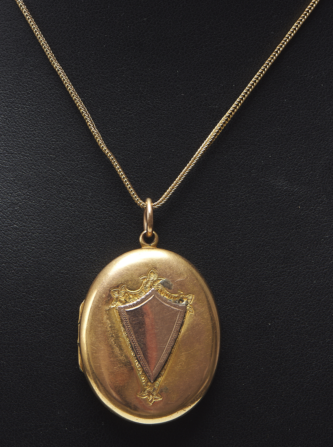 AN ANTIQUE OVAL HINGED LOCKET IN 15CT GOLD, TO A FINE GOLD PLATED CHAIN, 27X35MM, WEIGHT OF THE LOCKET 11GMS
