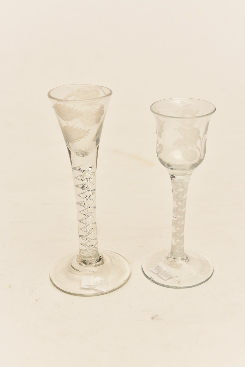 TWO ANTIQUE TWIST STEM GLASSES WITH ETCHED THISTLE DECORATION, LEONARD JOEL LOCAL DELIVERY SIZE: SMALL (16.5 CM H)