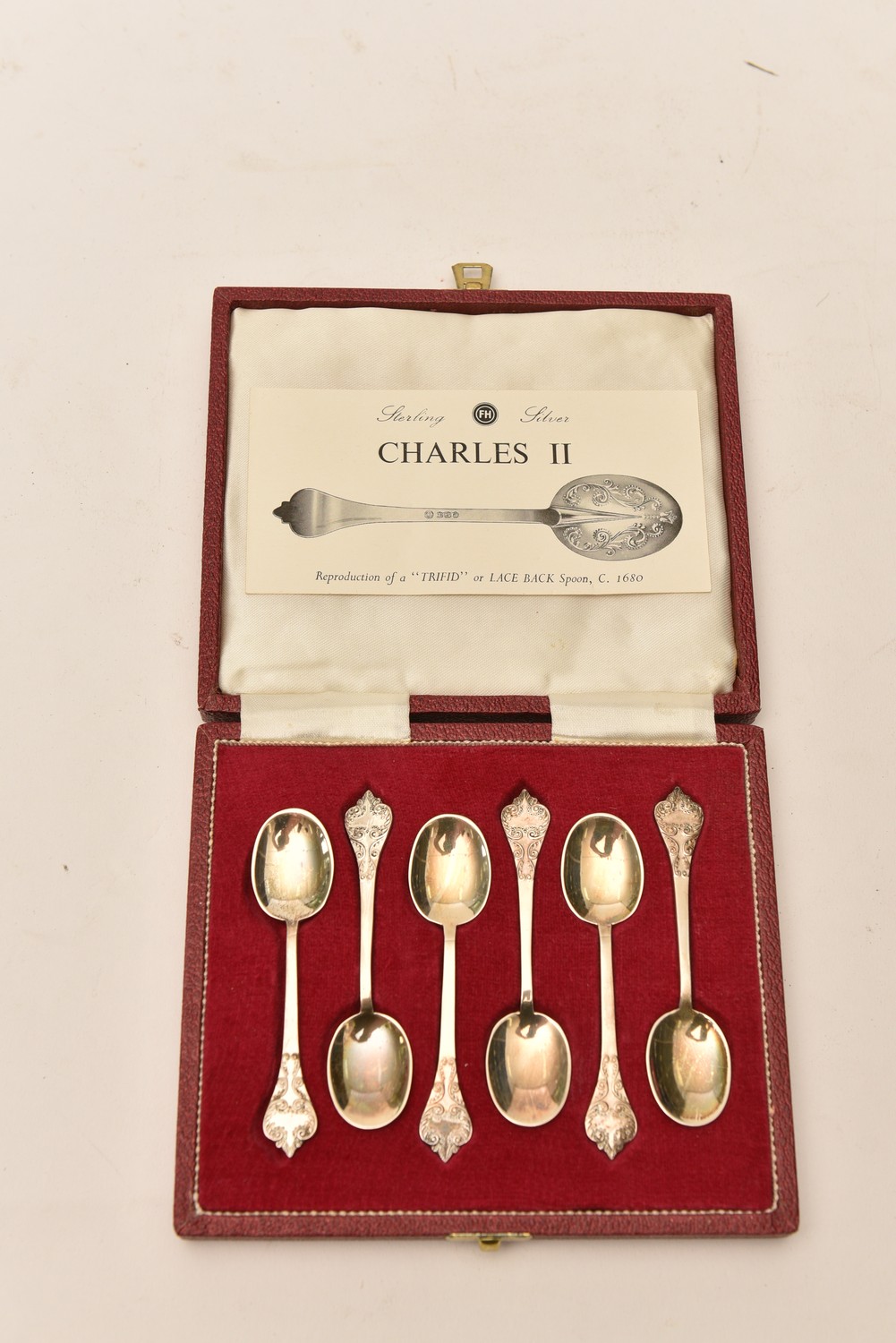 A SET OF SIX STERLING SILVER REPRODUCTION 'TRIFID' SPOONS (BOX 15 CM), LEONARD JOEL LOCAL DELIVERY SIZE: SMALL