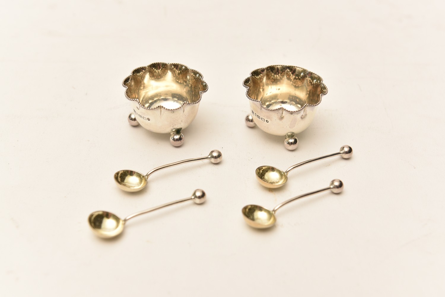 TWO STERLING SILVER SALTS TOGETHER WITH FOUR SILVER SALT SPOONS (15 CM W), LEONARD JOEL LOCAL DELIVERY SIZE: SMALL