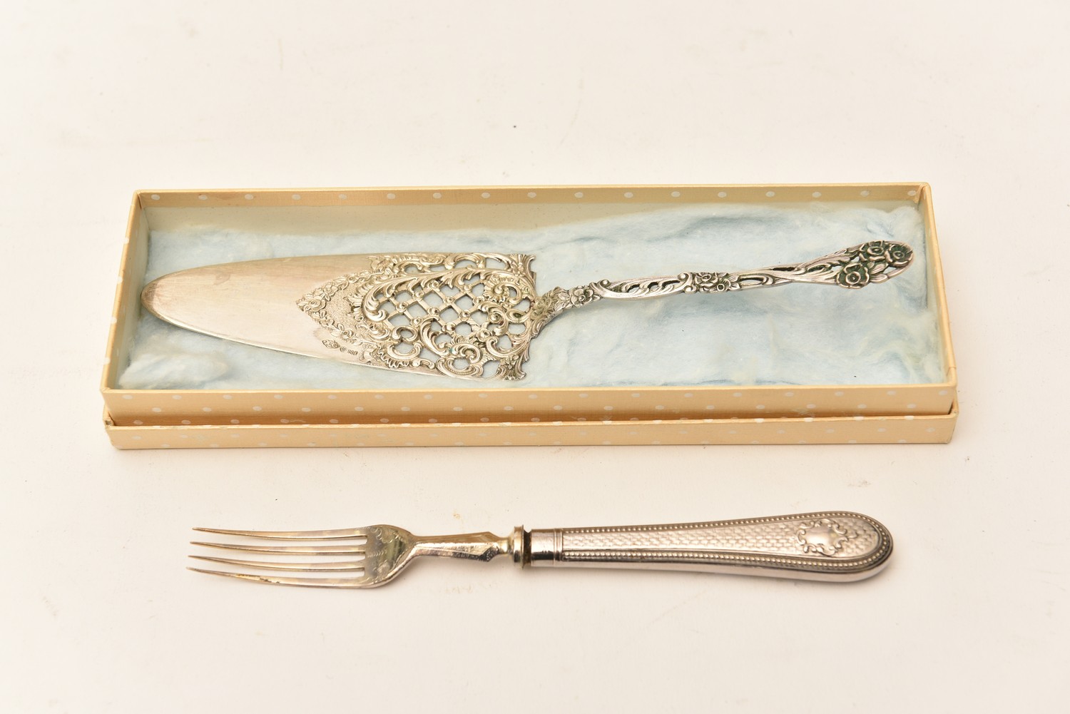 AN 800 SILVER CAKE SERVER TOGETHER WITH FORK (22.5 CM W), LEONARD JOEL LOCAL DELIVERY SIZE: SMALL