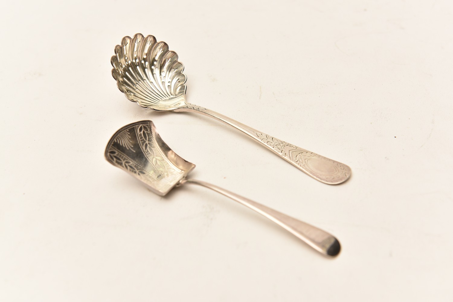 A STERLING SILVER TEA CADDY SPOON TOGETHER WITH STERLING SILVER SIFTER, LEONARD JOEL LOCAL DELIVERY SIZE: SMALL