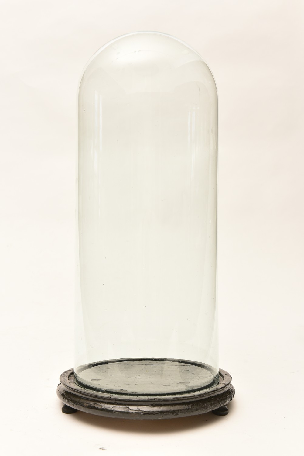 A LARGE FRENCH GLASS DOME ON EBONISED BASE (A/F) (54 CM H), LEONARD JOEL LOCAL DELIVERY SIZE: SMALL