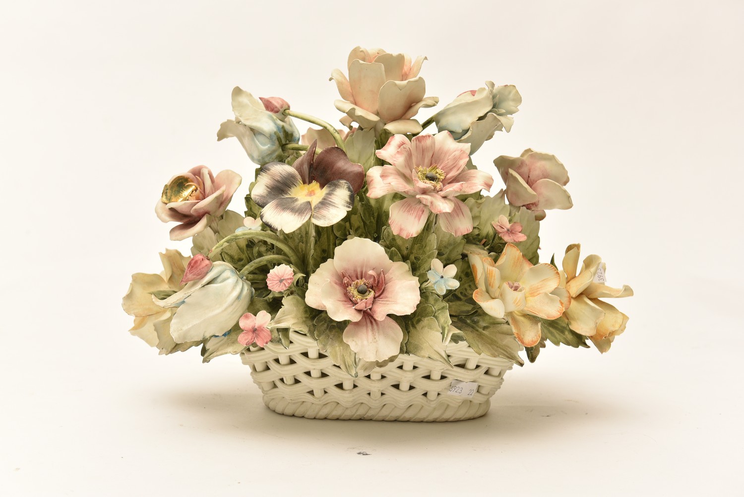 A LARGE 1940S ITALIAN CAPODIMONTE FLOWER GROUP IN BASKET WITH ORIGINAL LABEL (36 CM W), LEONARD JOEL LOCAL DELIVERY SIZE: SMALL