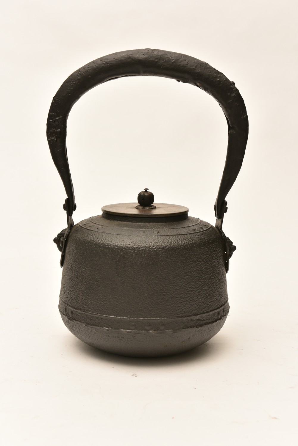 A LARGE JAPANESE CAST IRON TETSUBIN POT WITH ORIGINAL COPPER LID (20 CM D), LEONARD JOEL LOCAL DELIVERY SIZE: SMALL