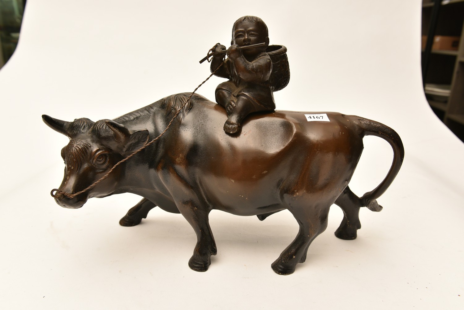 AN ORIENTAL BRONZED FIGURE OF A FLUTE PLAYING BOY ATOP A COW (38 CM H), LEONARD JOEL LOCAL DELIVERY SIZE: SMALL