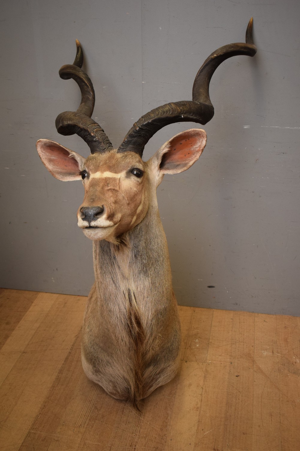 A LARGE 1960S TAXIDERMY AFRICAN SPIRAL HORNED ANTELOPE SHOULDER MOUNT WITH ORIGINAL ANTLERS (APPROX 150H x 106W CM) (PLEASE NOTE THIS HEAVY ITEM MUST BE REMOVED BY CARRIERS AT THE CUSTOMER'S EXPENSE. LEONARD JOEL STAFF CANNOT ASSIST CARRYING THIS ITEM) (X-LARGE ITEM)