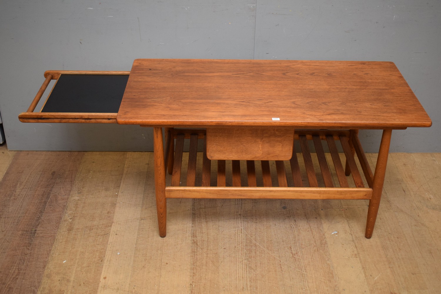 A DANISH TEAK AND OAK COFFEE TABLE BY EJVIND A JOHANNSEN FOR FDB WITH SLIDING DRAWER AND EXTENSION (55H x 110W x 55D CM) (LEONARD JOEL DELIVERY SIZE: MEDIUM)