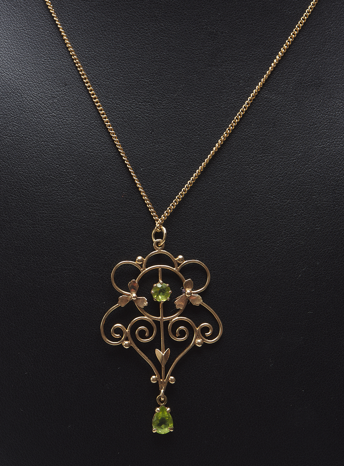 AN EDWARDIAN PERIDOT PENDANT WITH CHAIN IN 9CT GOLD, LENGTH 45CMS, 5.8GMS