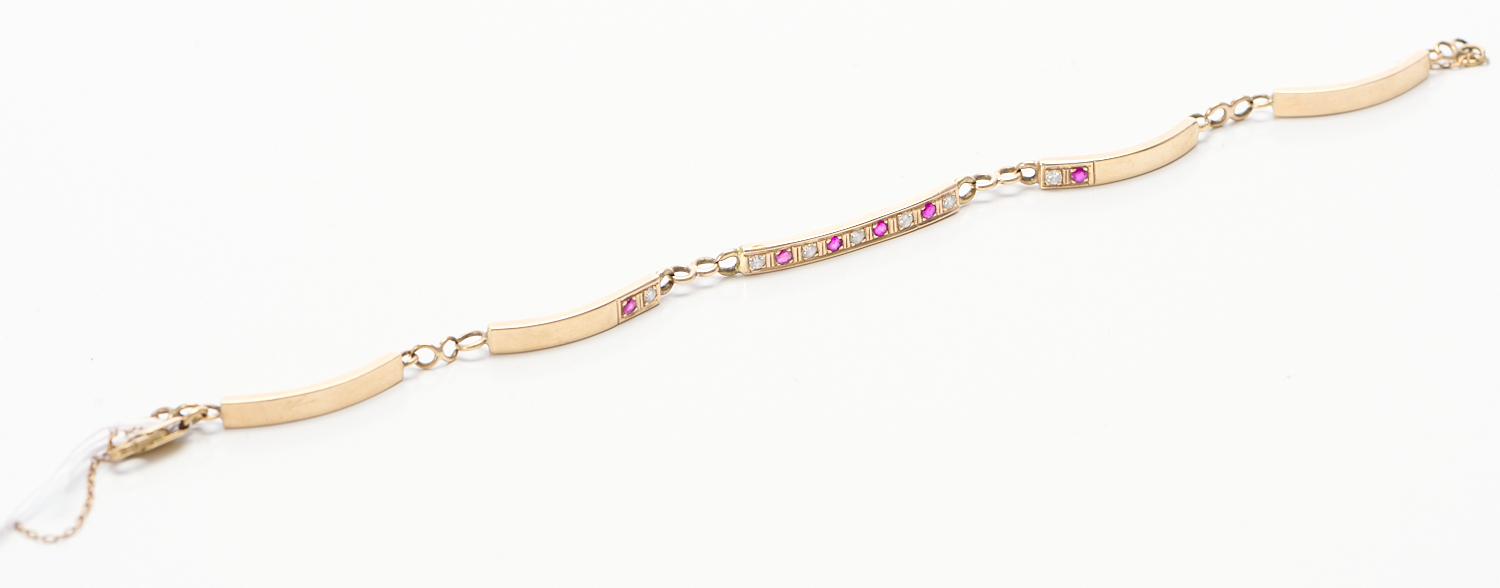 A RUBY AND DIAMOND BRACELET IN 9CT GOLD, LENGTH 20CMS, 11.7GMS