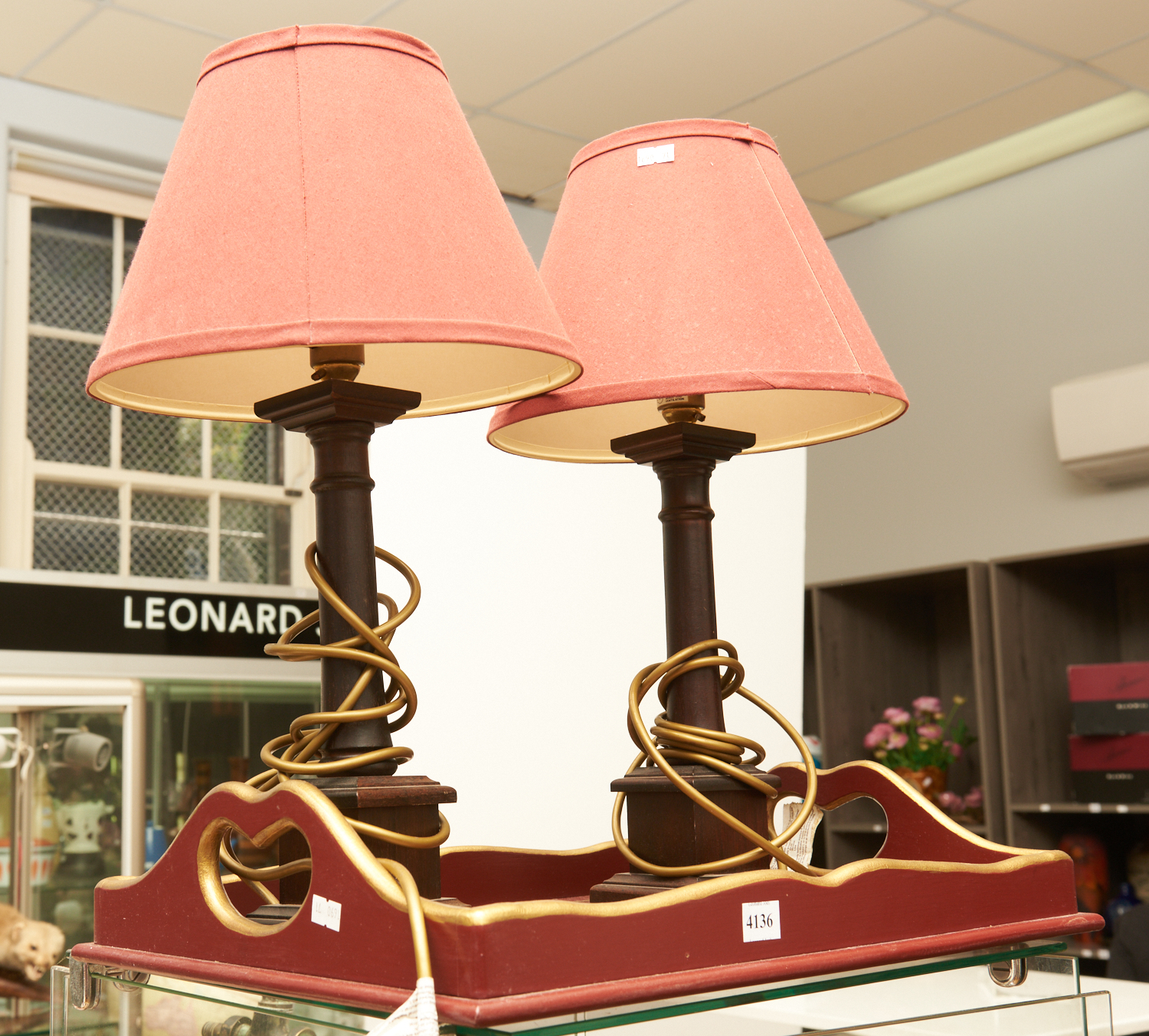 A GILT DECORATED TRAY AND TWO TABLE LAMPS, LEONARD JOEL LOCAL DELIVERY SIZE: SMALL