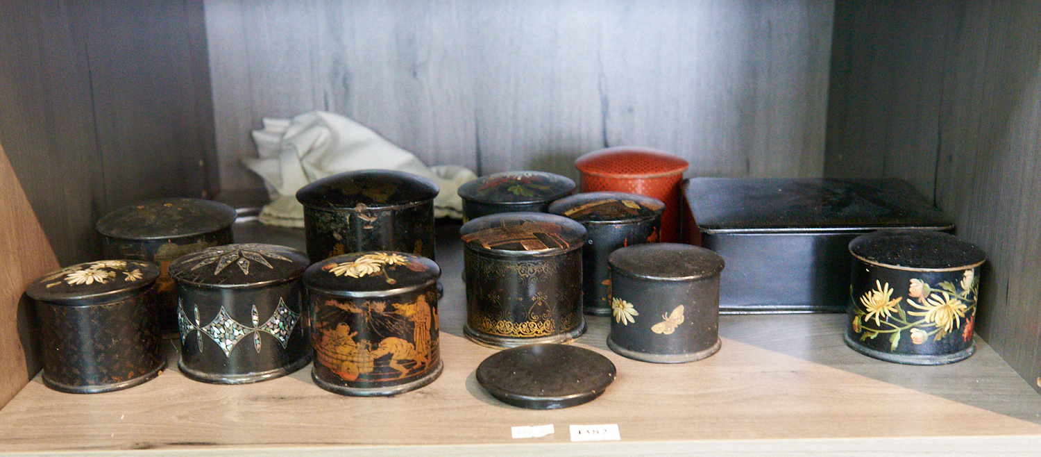 A SHELF OF VARIOUS 19TH CENTURY LACQUER BOXES, LEONARD JOEL LOCAL DELIVERY SIZE: SMALL