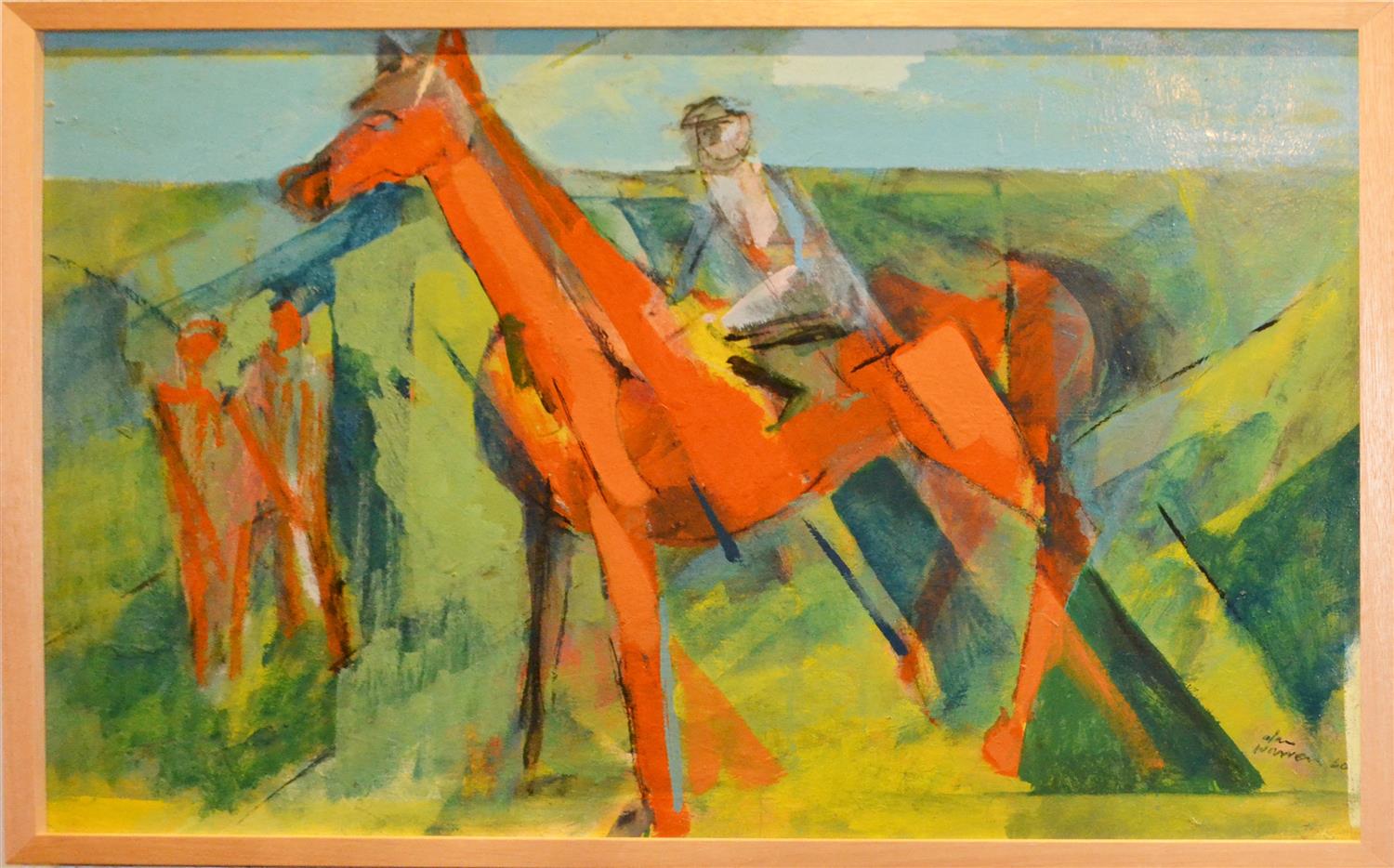 ALAN WARREN, THE PROUD THOROUGHBRED 1960, ENAMEL ON HARDBOARD, 76 X 107CM, FRAME SIZE: 82 X 113CM, CONDITION: GOOD WITH SOME SCRATCHES, CRACKING AND SURFACE DUST CONSISTENT WITH AGE, LEONARD JOEL DELIVERY SIZE: LARGE