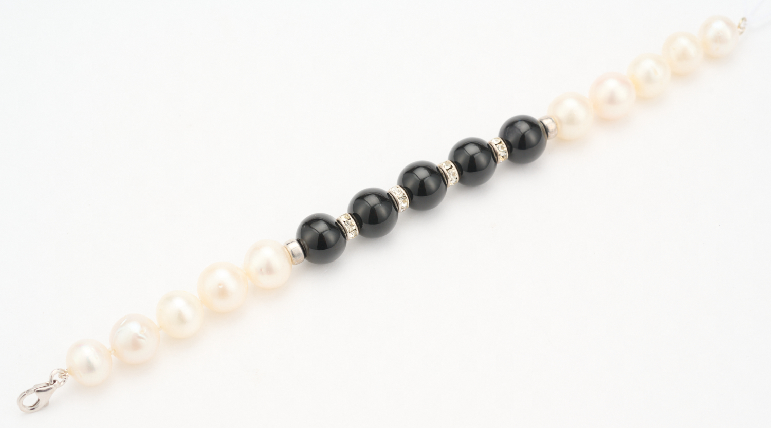 A SOUTH SEA PEARL AND ONYX BEAD BRACELET WITH RHINESTONE SET SPACER LINKS AND A PARROT CLASP IN STERLING SILVER, TOTAL LENGTH 200MM